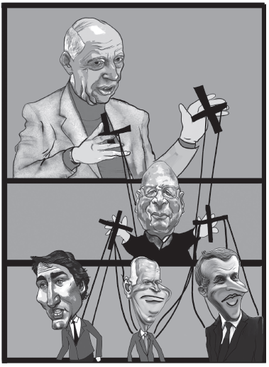 | Aujourd’hui, les chefs d’État (Trudeau, Biden, Macron) semblent être manipulés comme des marionnettes par le Forum Économique Mondial dirigé par Klaus Schwab, lui-même manipulé par la Haute Finance Internationale, représentée ici par Jacob Rothschild, dans le but d’installer un gouvernement mondial et une monnaie mondiale. |