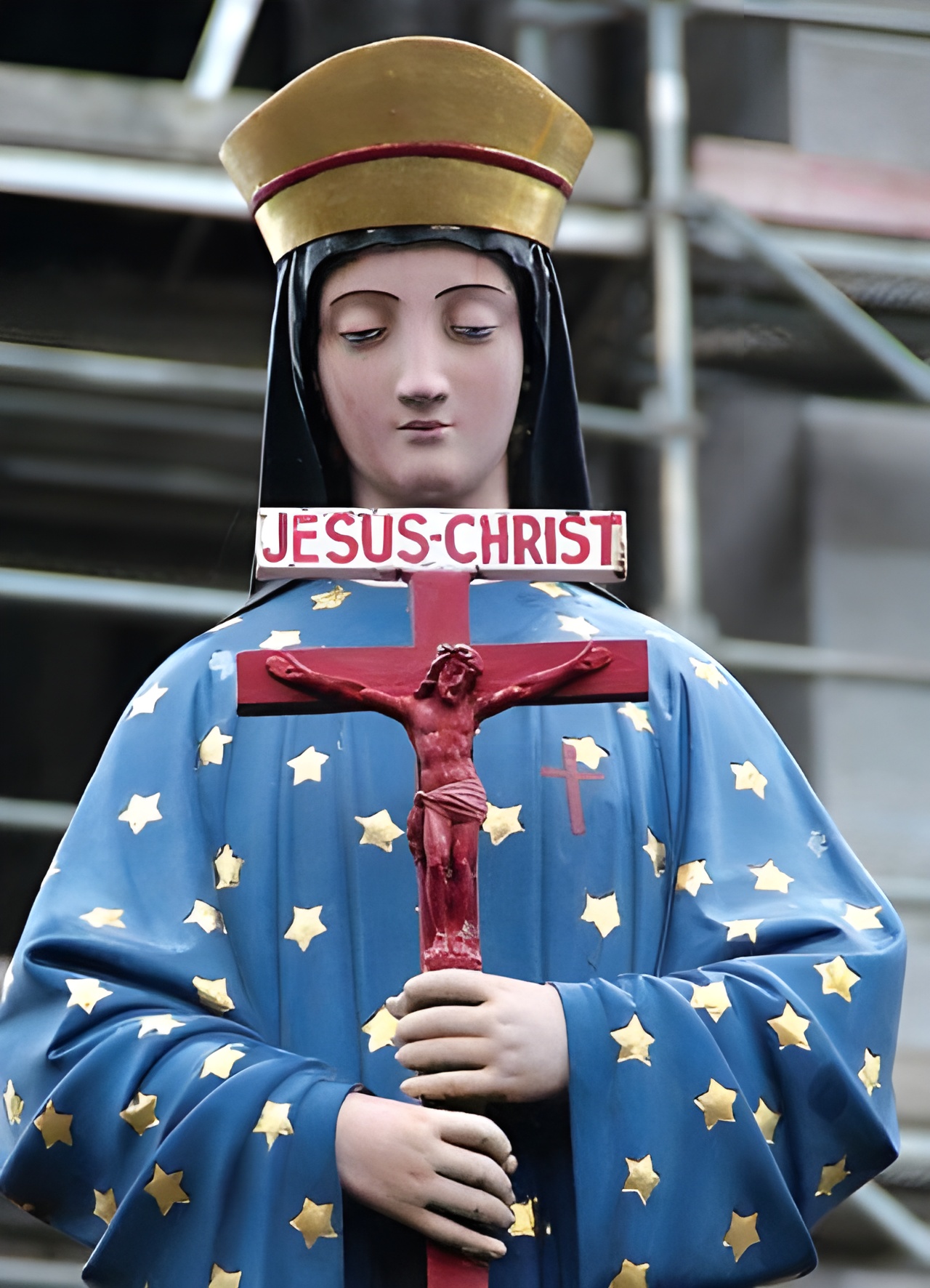 Après un autre cantique dont le refrain est «Parce Domine» son visage est empreint d’une tristesse indicible. Une croix rouge vif apparaît devant elle, portant le crucifié d’un rouge foncé. Au sommet de la croix, une traverse blanche avec un nom écrit en lettres rouges couleur sang: JÉSUS-CHRIST; Marie prend la croix à deux mains et la présente aux enfants. Une petite étoile vient allumer les bougies de l’ovale. On prie en silence en pleurant. On chante «Ave Maris Stella». Le crucifix rouge disparaît; Marie reprend l’attitude du début et sourit à nouveau. Deux petites croix blanches apparaissent sur ses épaules.