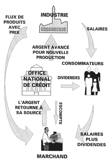 Puisque les salaires ne suffisent pas pour acheter toute la production, l’Office de Crédit comble la différence par l’émission d’un dividende périodique à tous les citoyens. La rencontre des consommateurs et des produits se fait chez le marchand, et lorsqu’un produit est acheté (consommé), l’argent qui avait été avancé au début de la production de ce produit retourne à sa source, l’Office National de Crédit, ayant ainsi accompli sa fonction et terminé sa course dans le circuit financier, puisque le produit a atteint le consommateur.