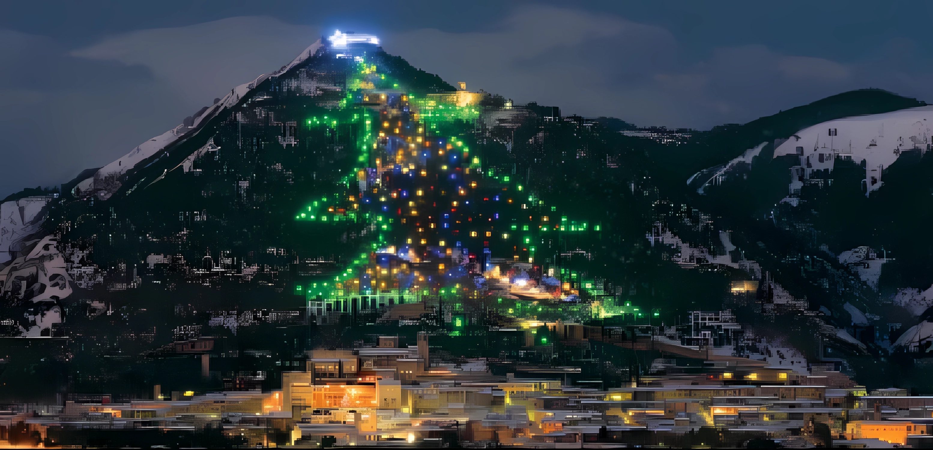 «L’arbre de Noël» de Gubbio est entré dans le livre Guinness des records en 1991 avec une hauteur de 650 mètres (2130 pieds) et une largeur à sa base de 350 mètres. Il est composé de 3000 ampoules et de 8,5 kilomètres de cables électriques disposées sur les flancs du mont Ingino; au sommet de la colline se trouve la basilique de Saint-Ubald, patron de la ville.