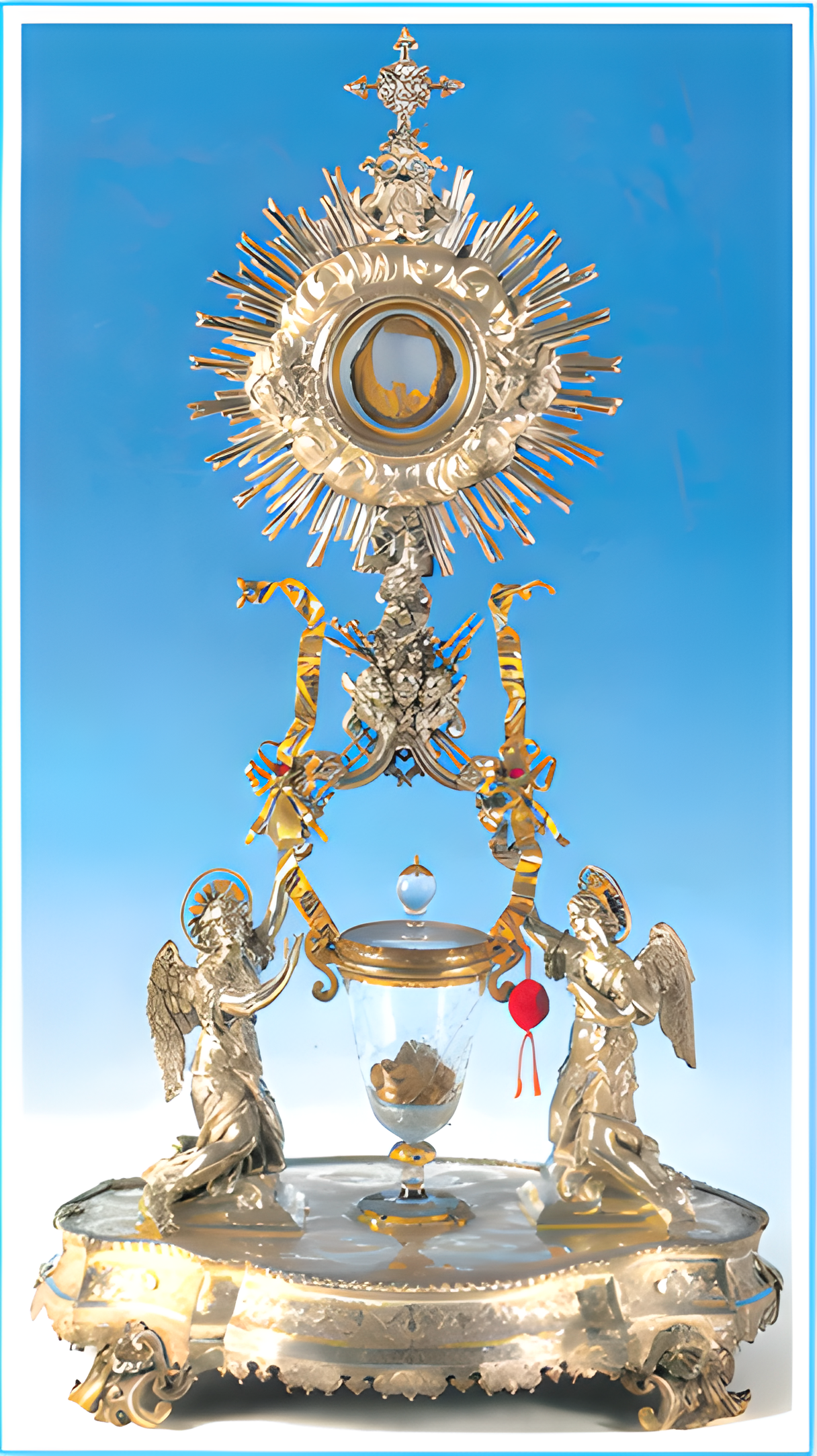 Le reliquaire du miracle eucharistique de Lanciano: Le morceau de chair se trouve dans un ostensoir, et les caillots de sang dans un calice en cristal.
