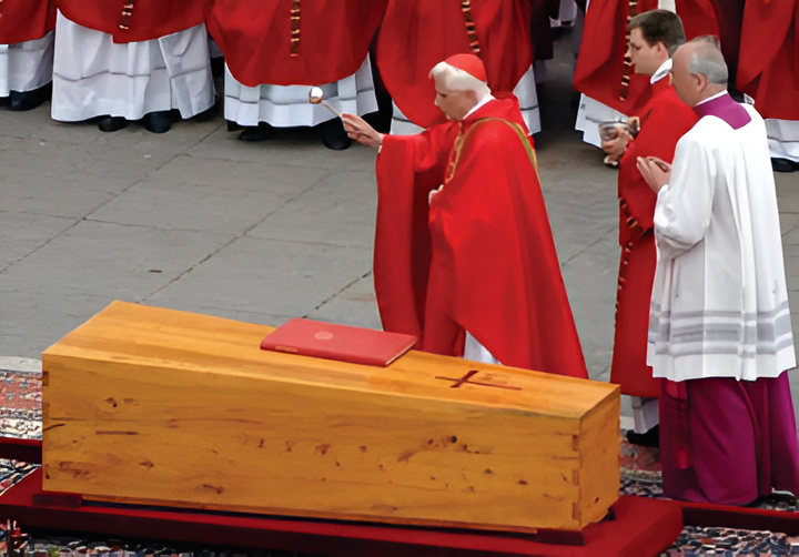 | Le cardinal Ratzinger bénissant le cercueil de Jean-Paul II |