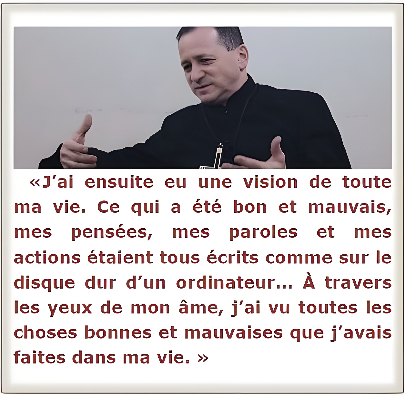 «J’ai ensuite eu une vision de toute ma vie. Ce qui a été bon et mauvais, mes pensées, mes paroles et mes actions étaient tous écrits comme sur le disque dur d’un ordinateur... À travers les yeux de mon âme, j’ai vu toutes les choses bonnes et mauvaises que j’avais faites dans ma vie. »