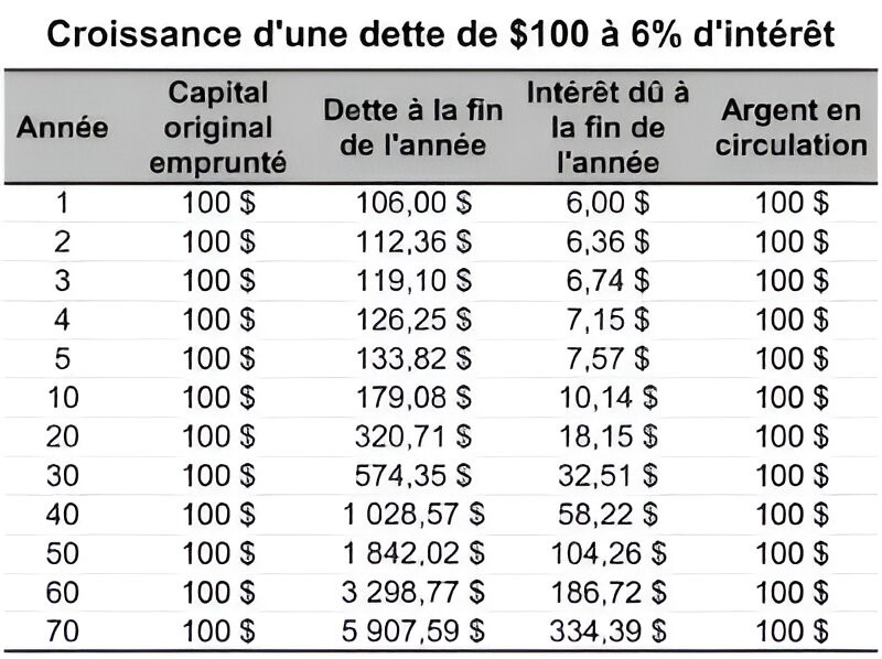 La dette augmente relativement peu les premières années, mais augmente ensuite très rapidement. A remarquer, la dette augmente à chaque année, mais le montant original emprunté (argent en circulation) demeure toujours le même : 100 $. En aucun temps la dette ne peut être payée, pas même à la fin de la première année : seulement 100 $ en circulation et une dette de 106 $. Et à la fin de la cinquantième année, tout l'argent en circulation (100 $), n'est même pas suffisant pour payer l'intérêt sur la dette : 104,26 $.
