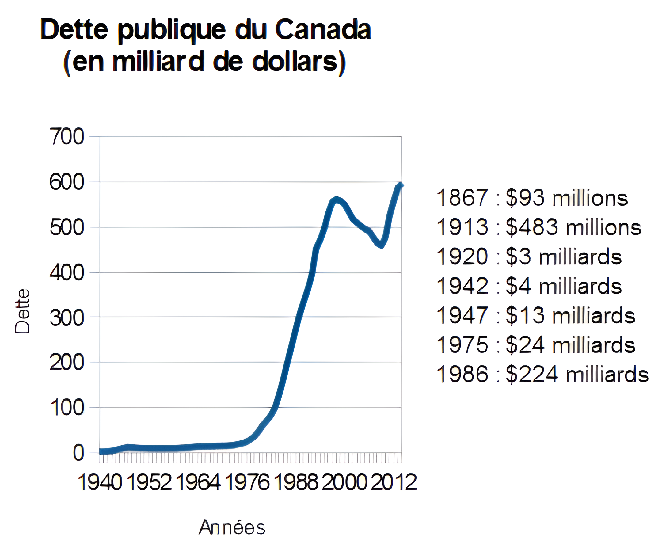 Mais comment expliquer la hausse phénoménale des vingt dernières années, alors que la dette passait de 24 milliards $ en 1975 à 224 milliards $ en 1986, puis à 575 milliards $ en 1996, alors que le Canada était en temps de paix et n'a pas eu à emprunter pour la guerre ?
