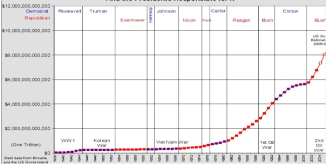 La dette des Etats-Unis suit la même courbe que celle du Canada, mais avec des nombres dix fois plus gros. Comme c'était le cas pour le Canada, les premières hausses significatives de la dette publique des Etats-Unis ont eu lieu durant les périodes de guerre : Guerre Civile américaine (1861-65), Première et Deuxième Guerres mondiales. De 1975 à 1986, la dette est passée de 533 milliards $ à 2073 milliards $. En date du 5 Septembre 2006, cette dette était de 8500 milliards $ (28 490 $ pour chaque citoyen américain), et continue de croître de façon exponentielle. Pour l'année fiscale 2004, les frais d'intérêt ont été de 321 milliards.)