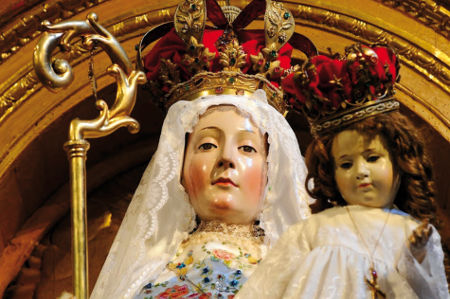 | La statue miraculeuse de Notre-Dame du Bon Succès, terminée par les anges, dans la chapelle des Soeurs de l’Immaculée Conception à Quito. |