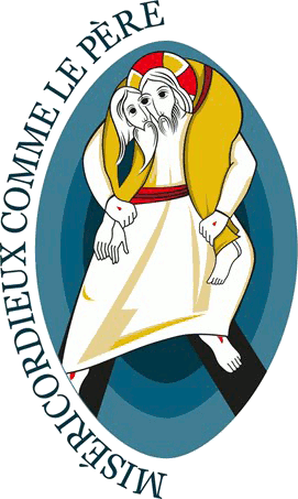 Le logo et la devise de l'Année Sainte représentent une somme théologique de la miséricorde. Tirée de Luc, cette devise propose de vivre la miséricorde à l’exemple du Père, qui demande de ne juger ni condamner, mais de pardonner. d'offrir amour et pardon sans mesure. Le logo, oeuvre du Père Rupnick, exprime l’amour du Christ qui charge sur ses épaules l’homme égaré. Le dessin tend à faire comprendre que le Bon Pasteur touche en profondeur la chair de l’homme et qu’il le fait avec un tel amour qu’il lui change la vie. Il y a également un détail qui ne peut pas échapper à l’attention: Avec une miséricorde infinie, le Bon Pasteur charge sur lui l’humanité... Le Christ voit par les yeux d’Adam et celui-ci par les yeux du Christ. Chaque homme découvre ainsi dans le Christ, nouvel Adam, son humanité et le futur qui l’attend. Cette scène se situe à l’intérieur d'une mandorle (figure en forme d’ovale ou d’amande), elle aussi un symbole cher à l’iconographie ancienne appelant la présence de deux natures, la divine et l’humaine, dans le Christ. (Source: Radio Vatican)