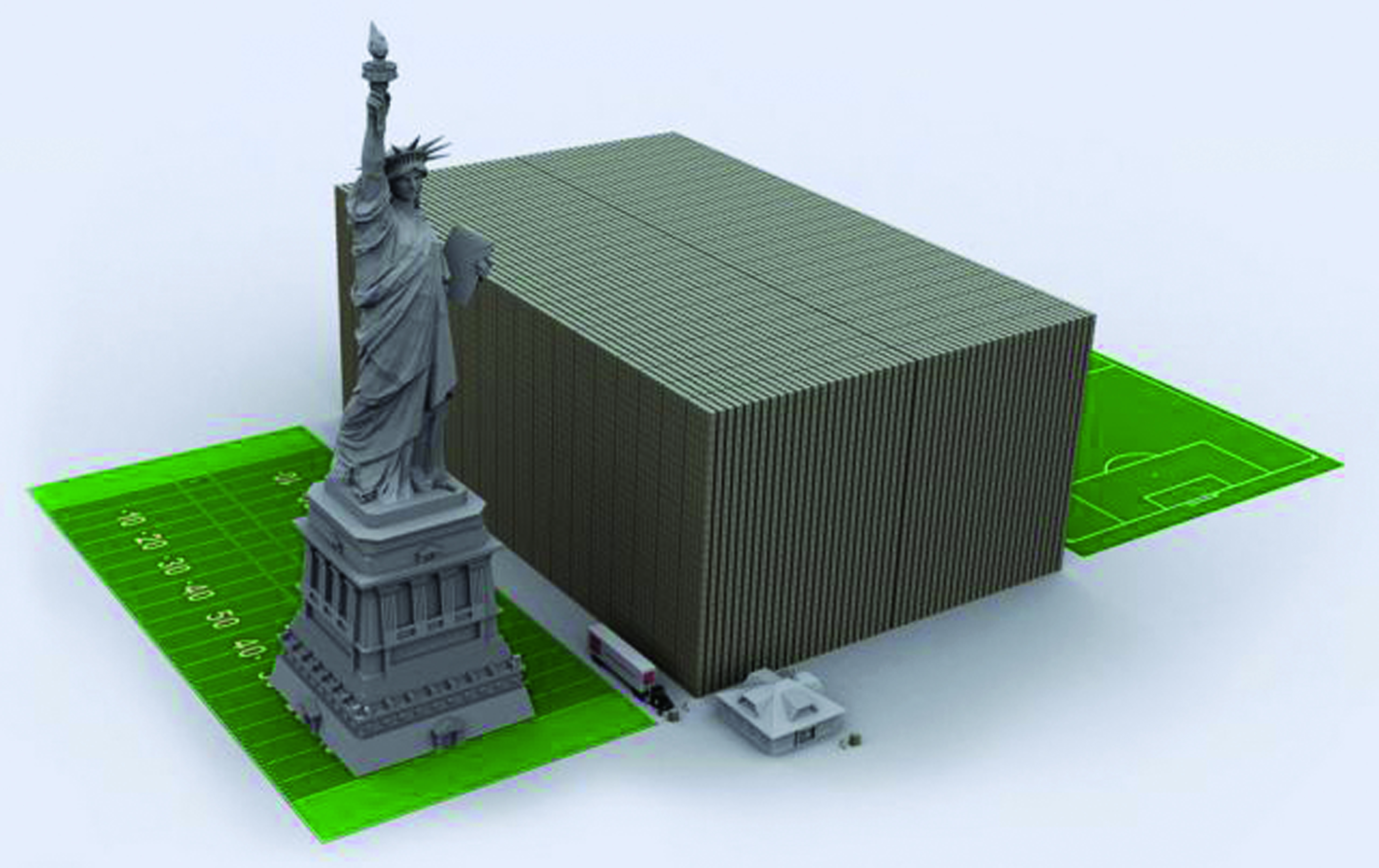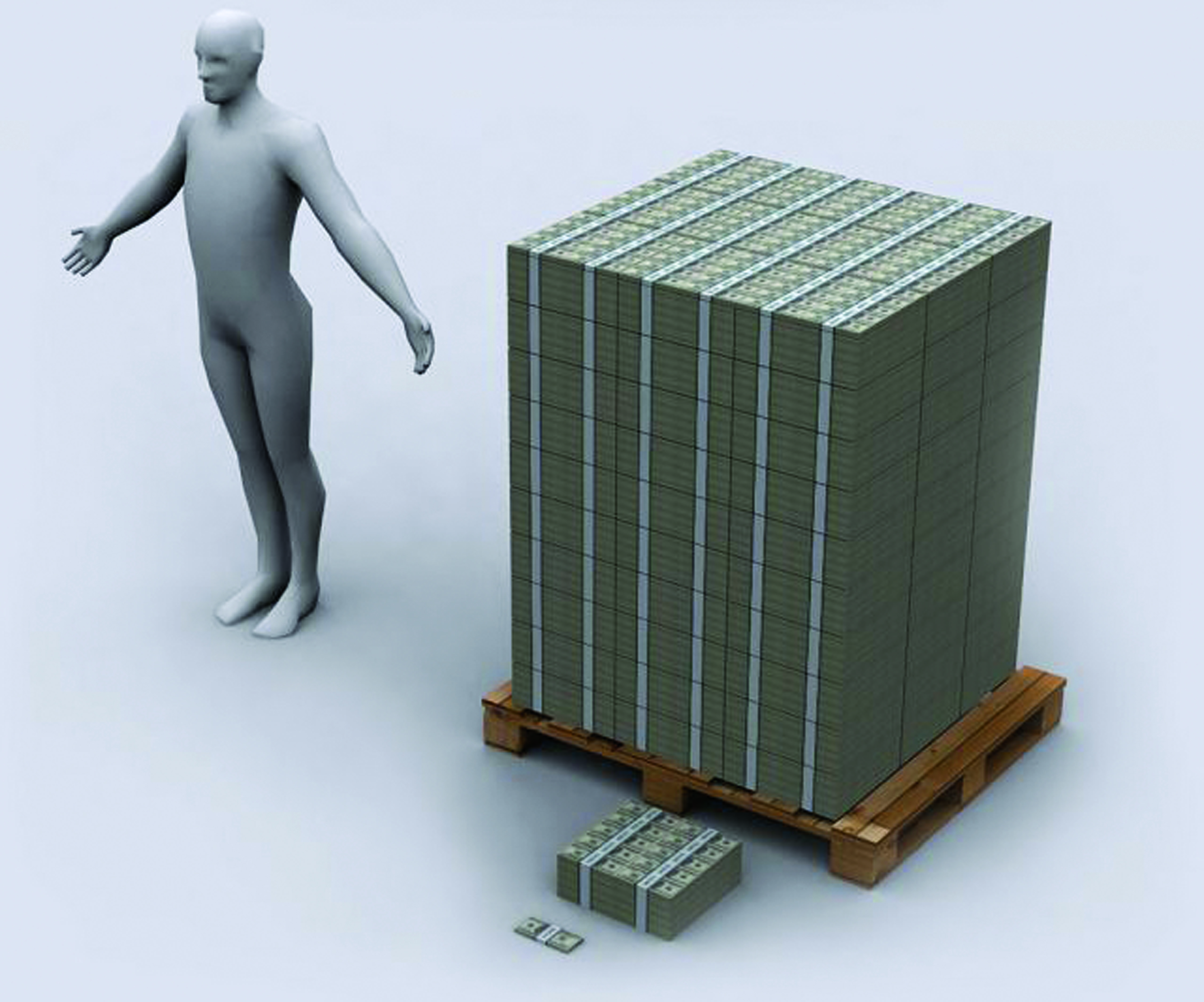 En dépensant un million de dollars par jour depuis la naissance de Jésus, on n’aurait même pas encore dépensé un trillion $ en 2012... mais environ 700 milliards $, le montant versé aux banques américaines lors du récent plan de sauvetage. Comparez la quantité de piles de 100 dollars avec la grandeur d’un terrain de football ou un Boeing 747...