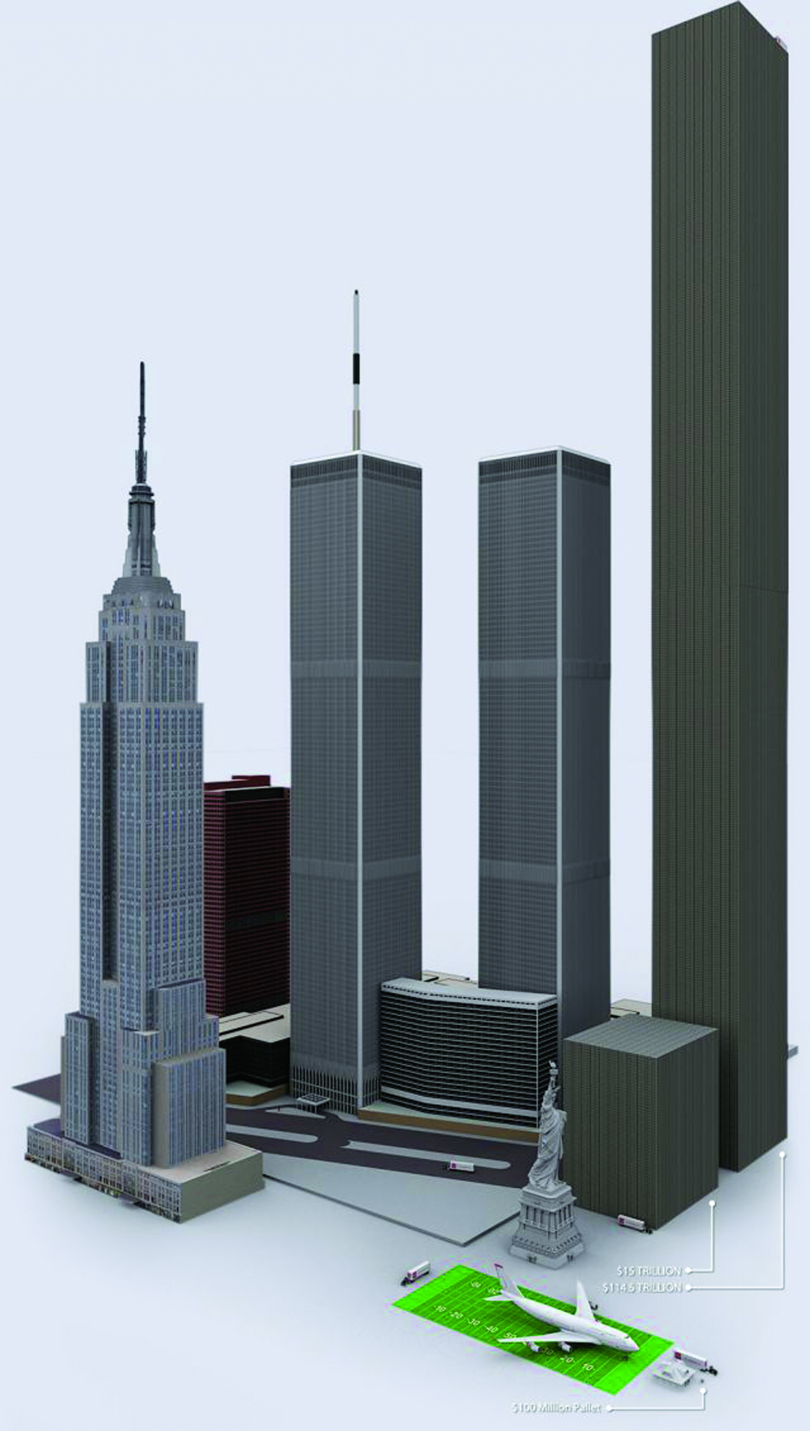 Les États-Unis d’Amérique sont la nation la plus endettée de toute l’histoire de la civilisation humaine. À la fin de 2011, la dette du gouvernement fédéral américain atteignait les 15 trillions de dollars (15.000.000.000.000 $). Comment s’imaginer l’ampleur d’un million, d’un milliard, ou de mille milliards de dollars? On peut s’aider en imaginant ces sommes en piles de billets de 100 dollars...