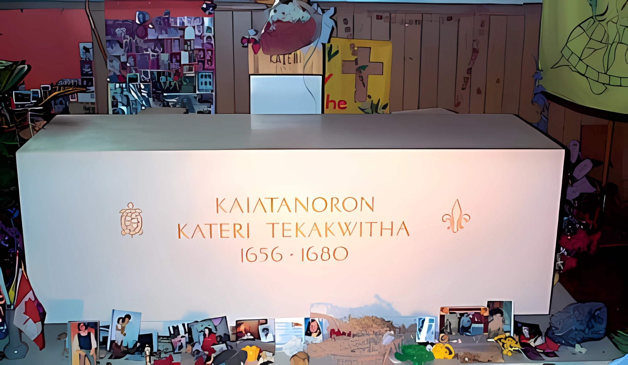La tombe de Kateri Tekakwitha se retrouve dans l’église de la Mission Saint-François-Xavier à Kahnawake, sur les rives du fleuve Saint-Laurent, au sud-ouest de Montréal.