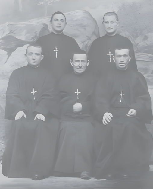 Cinq des six volontaires pour la mission aux États-Unis, Louis Even (Frère Amaury-Joseph) est le premier à gauche, rangée du haut.