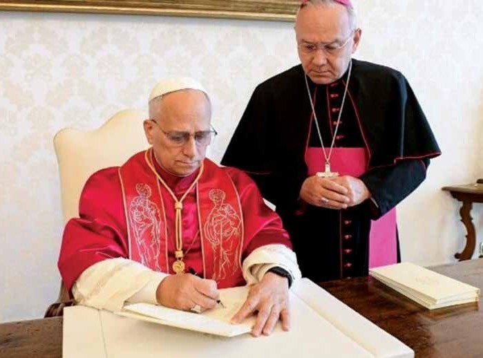 | Le 4 octobre 2025, en la fête de saint François d’Assise, le pape Léon XIV signait Dilexi te en présence de Mgr Edgar Peña Parra, substitut à la Secrétairerie d’État du Vatican. |