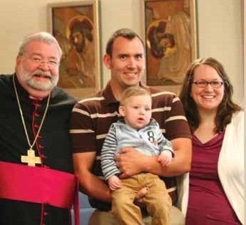 | Le petit James Fulton avec ses parents en 2014, accompagné par Mgr Jenky, alors évêque de Peoria |